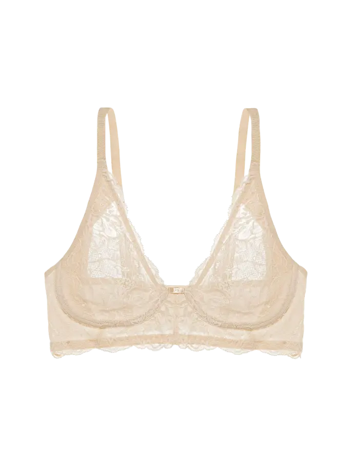 • Sutiã de renda bege claro com padrão floral e laço dourado