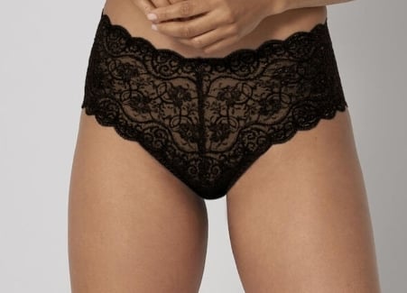 • Cueca feminina preta em renda com padrão floral e bordas onduladas